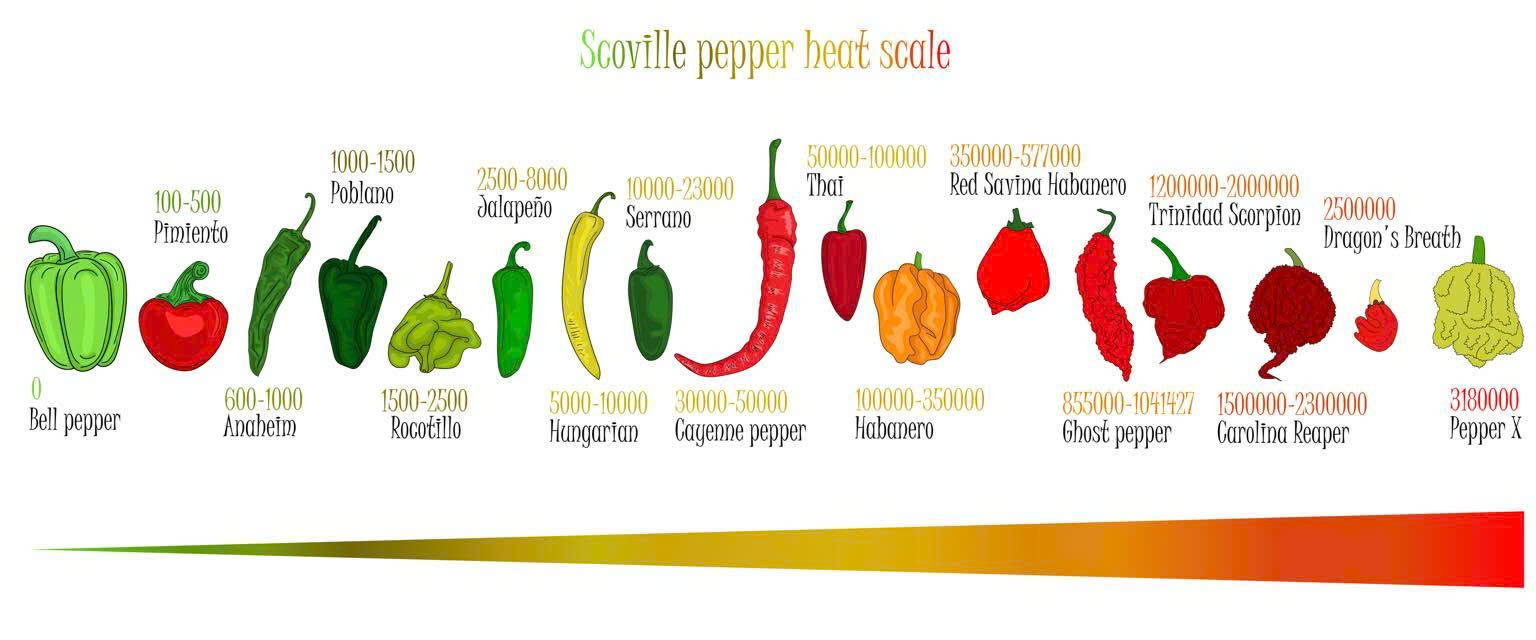 Thang đo Scoville (SHU) là hệ quy chiếu độ cay dựa trên hàm lượng capsaicin – hợp chất tạo cảm giác cay trong ớt. Theo biểu đồ Scoville, độ cay được chia thành các nhóm rõ rệt: